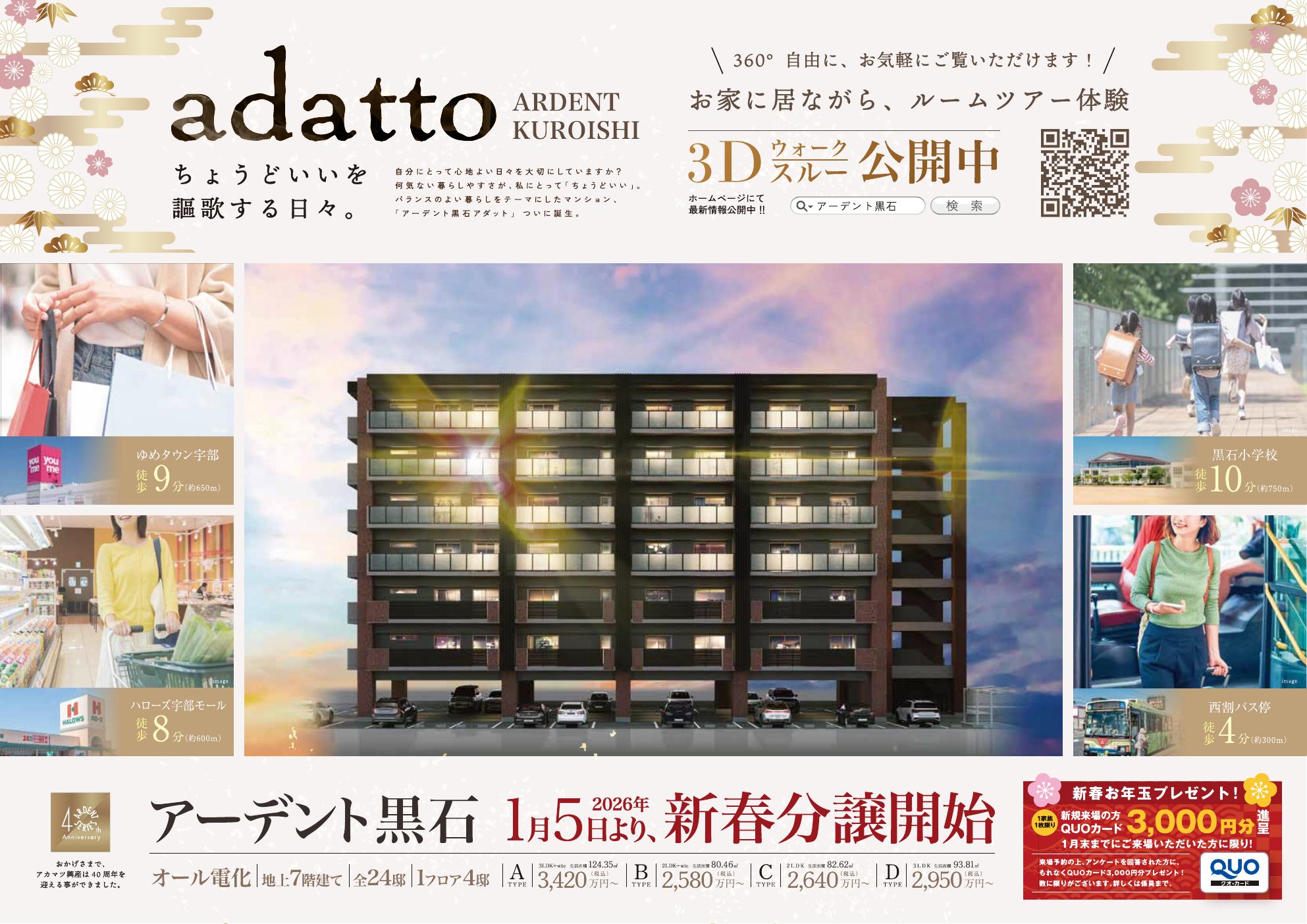 新着情報 2026.01.05 新着情報 新年あけましておめでとうございます 2025.12.25 現場の様子 工事の進捗状況 2025.12.18 最新チラシ 新春QUOカード プレゼント! 新着情報一覧を見る 最新のチラシ PDFでチラシを見る PDFでチラシを見る