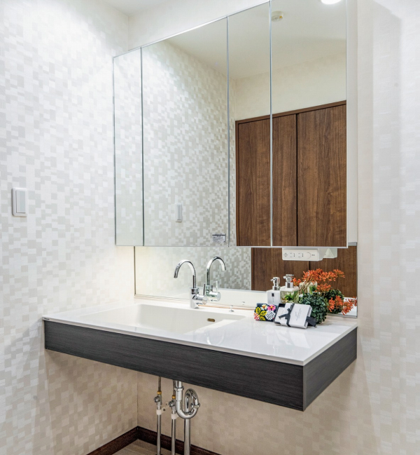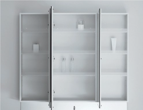 ミラー裏も収納スペースが充実しており、左右の扉を半開きにすると三面鏡に早変わり!