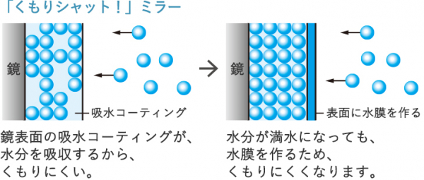 ミラーの表面に吸水コーティングを施しているので曇りにくく、