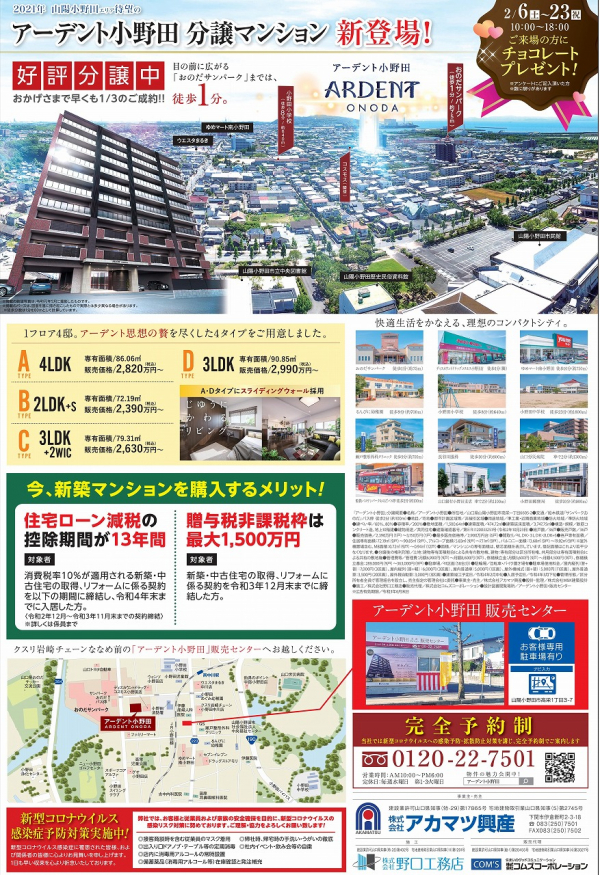 ご来場予約・資料請求・お問合せはアーデント小野田販売センターまで!