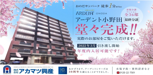 ご来場予約・資料請求・お問合せはアーデント小野田販売センターまで!