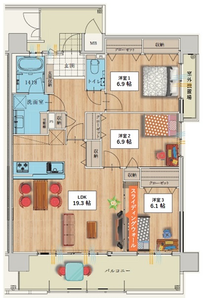 リビングと洋室3の間にある可動式間仕切り『スライディングウォール』は