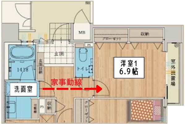 洗面室の向かいにある洋室をランドリールーム兼 衣裳部屋にすれば、