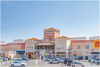 目の前に広がるショッピングモール「おのだサンパーク」までは徒歩1分。