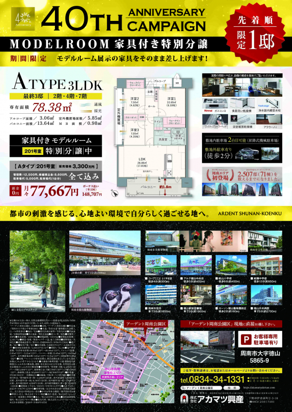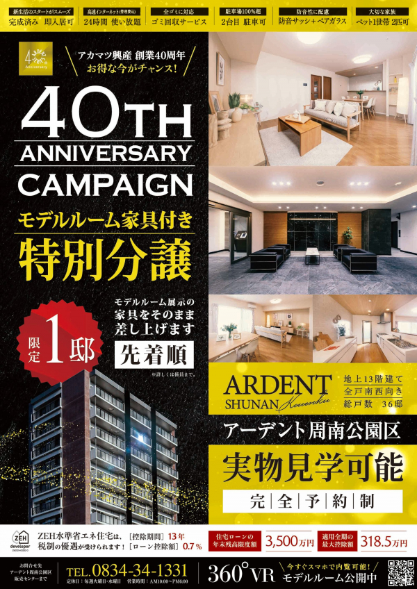 山口県周南市にてご案内させていただいております、新築分譲マンション『アーデント周南公園区』 アーデントマンション40周年を記念してAタイプモデルルーム特別分譲開催中です! 物価高騰の今、そもそもの物件価格も大変お買い得ではありますが、更に新生活の応援キャンペーンです♪ この機会に是非一度ご来場いただき、ご自身の目で、身体でご体感ください。 アーデント周南公園区販売センター ☎0834-34-1331